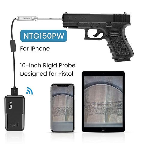 Пистолетный бороскоп Teslong NTG150PW длиной 10 дюймов, камера для контроля оружия со светодиодной подсветкой и возможность подключения к сети Wi-Fi. Работает с iPhone, iPad, Android, Windows и MacBook через Wi-Fi или USB.