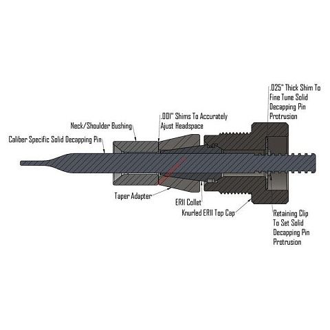 Твердый штифт для удаления капсюля - разработанный так, чтобы его диаметр был немного меньше диаметра пули, цельный штифт для удаления капсюля НЕ БУДЕТ расширять размер шейки, однако исправит вмятину на шейке, повысив ее однородность. Использование наконечника штифта номинального диаметра 0,058 дюйма для работы с малым капсюлем.