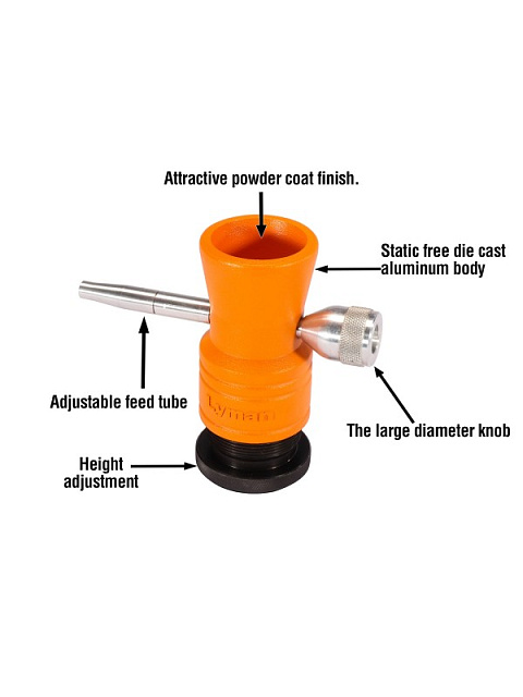 Lyman Brass Smith Powder Trickler был разработан с учетом требований серьезного стрелка, сочетающего в себе все функции, которые ему нужны. Начиная от антистатического алюминиевого корпуса, до стального регулируемого по высоте основания, укомплектован дополнительной удлиняющей алюминиевой подающей трубкой. Ручка большого диаметра на подающей трубке дает вам возможность дозировать порох буквально по отдельным гранулам.