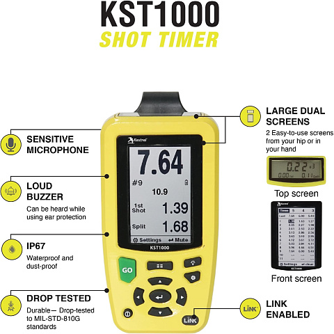 Стрелковый таймер KST1000 от Kestrel — один из самых универсальных, прочных и надежных таймеров выстрела на рынке. Он оснащен 5 предустановками настроек, которые предоставляют 5 ячеек, содержащих задержки запуска, парное время и многое другое. Эти предустановки настроек особенно полезны для тренировок, когда стрелок должен переключаться между 2 упражнениями с разными задержками запуска и парным временем: установите первое упражнение в первом слоте предустановки, а два — во втором слоте предустановки, после чего стрелок может быстро переключаться между ними. KST1000 совместим с холостой стрельбой, стрельбой с модератором и повторяющимися упражнениями благодаря регулируемым настройкам чувствительности и эха, а также стартовому циклу для автоматизации кнопки «go». Другие функции включают в себя сверхгромкий зуммер и простые в использовании двойные экраны, которые можно просматривать с бедра или руки. Кроме того, KST1000 водонепроницаем, защищен от пыли и испытан на падение.
