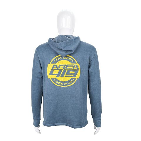 Толстовка с капюшоном с логотипом в меланжево-сине-зеленом цвете с золотым принтом.   7,4 унции, 60/40 хлопок/полиэстер Смесь CVC Твиловая задняя тесьма на горловине Алюминиевые втулки Окрашенный в тон шнурок Прорезной карман Манжеты резинкой 1×1