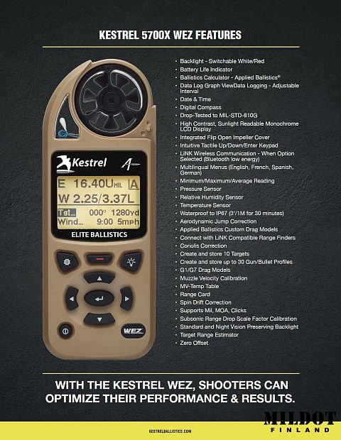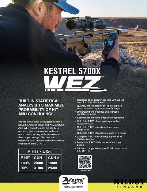 Кестрел революционизировал подход к стрельбе на дальние дистанции посредством статистического анализа, который должен увеличить вероятность попадания и уверенность стрелка в своих способностях. С помощью Kestrel 5700XWEZ стрелок может рассчитать вероятность попадания в конкретную мишень с одного или нескольких расстояний с учетом разных оружейных профилей (т.е. из различного оружия). Как все метеостанции Кестрел, Kestrel 5700X WEZ имеет интуитивно понятный интерфейс, упрощающий применение метеостанции в полевых условиях без дополнительного электронного оборудования в целях проверки вашего оружия или реальной стрельбы.