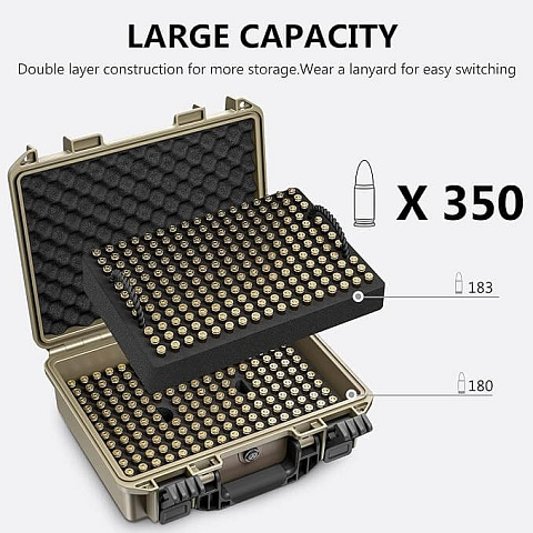 【Кейс на 350 патронов】Храните до 350 патронов с помощью пенопластовой вставки для боеприпасов. Боеприпасы удерживаются в 2 пенопластовых лотках, пенопластовый слой имеет 2 ручки, поднимите верхний слой для доступа к нижнему слою, что позволяет увеличить вместимость вдвое. Разделитель слоев из пенопласта гарантирует, что боеприпасы никогда не соприкасаются друг с другом, обеспечивая дополнительную защиту и упорядоченность ваших боеприпасов.