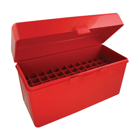Коробка MTM изготавливается  практически неразрушимого полипропилена. Защелка исключает возможность случайного открытия бокса и высыпания патронов.