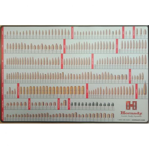 Удобный коврик-подставка с эталонами пуль, производимых Hornady.