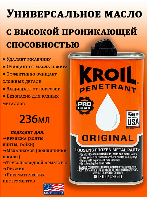 Универсальное масло Kano Kroil Масло Kano Kroil с высокой проникающей способностью идеально подходит для чистки и защиты оружия! Очищает и смазывает детали, образует прочную пленку, предотвращающую дальнейшие загрязнения.Используйте масло Kano Kroil для обработки болтов, винтов, шурупов, гаек, шкивов, штифтов, подшипников, оружия, труб, вентилей или других заржавевших металлических деталей, а так же для смазки инструментов на воздушной тяге, для удаления ржавчины, загустевшего масла и жира, для чистки винтовок и ружей.Масло Кано эффективно растворяет ржавчину и нагар, удаляет загустевшие масла, жиры и даже смолы, не повреждая металла. Надежно сохраняет стальные детали от коррозии и предотвращает образование налета. Вытесняет влагу с металлических поверхностей. Проникает даже в микротрещины - пространства, равные миллионной части дюйма (0.000,001; для сравнения: человеческий волос - 0.003 дюйма, крупица соли - 0.004). Сохраняет самые уязвимые детали при хранении вне помещений, во время длительной транспортировки, предохраняет от влияния неблагоприятных метеорологических условий (в том числе от замерзания зимой), не отвердевает, не липнет. Уменьшает трение сцепления, скольжения и качения в любых подвижных механизмах. Ослабляет крепко сидящие (пригар, окалина и ржавчина) резьбовые и прочие соединения. Быстро разрыхляет заржавевшие гайки и болты - освобождает прикипевшие валы, шкивы, гайки, штифты, подшипники и т.д. Хранить в недоступном для детей месте!