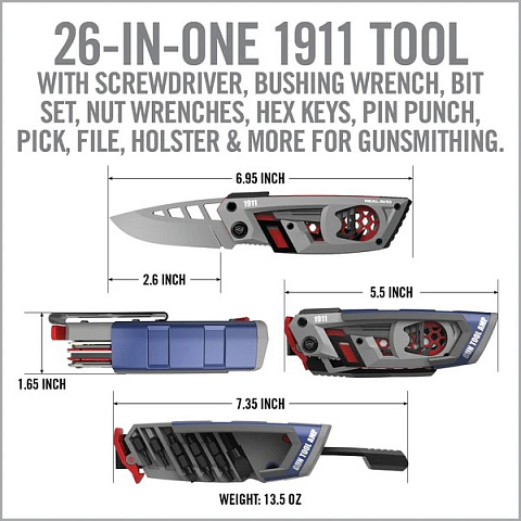 Это мульти-инструмент специализированный для платформы 1911, Gun Tool AMP® - 1911 дает возможность в полевых условиях эффективно и безопасно обслуживать оружие. Мультитул является прочным каркасом, в который интегрируется рабочий элемент. Полностью конструкция изготовлена из высококачественного титана и нержавеющей стали. Крепление позволяет носить мультитул как на поясе, так и цеплять на стропы MOLLE и другие подобные поверхности.Включает в себя: Клинок ножа в формате Drop point с отверстиями для облегчения. Пуансон (выколотка) Ударник на тыльной части. Накидной ключ в профиле рукоятки в формате 1911 Government/Officer (с обеих сторон конструкции каждый ). Скребок совмещенный, который может использоваться как вкладка, а также имеет открывалку для бутылок в основании. Крюк с интегрированными накидными гаечными ключами. Каркас с креплением и раскладной динамической отверткой, внутри него содержится блок с шестигранниками.