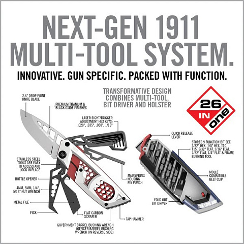 Это мульти-инструмент специализированный для платформы 1911, Gun Tool AMP® - 1911 дает возможность в полевых условиях эффективно и безопасно обслуживать оружие. Мультитул является прочным каркасом, в который интегрируется рабочий элемент. Полностью конструкция изготовлена из высококачественного титана и нержавеющей стали. Крепление позволяет носить мультитул как на поясе, так и цеплять на стропы MOLLE и другие подобные поверхности.
