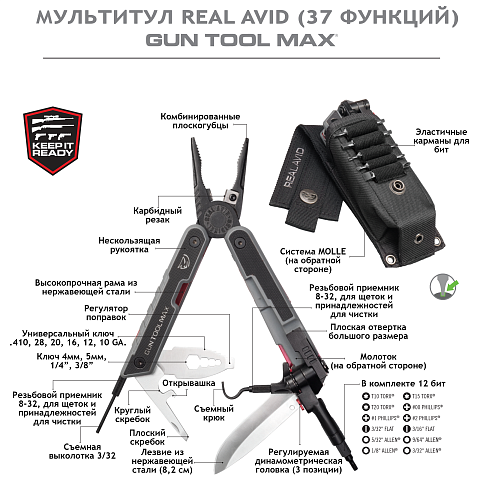 Gun Tool Max®  - это многофункциональный инструмент в виде мультитула, оснащенный 37 функциями, адаптированными к потребностям стрелков и охотников.  Он содержит все самые необходимые инструменты для обслуживания широкого спектра оружия - от пистолетов, револьверов, винтовок и карабинов до дробовиков. Рама и инструменты мультитула изготовлены из стали, а подкладка изготовлена из современного материала G-10, обеспечивающего надежный захват.  Вместе с инструментом, в комплекте, идет чехол из нейлона, застегивающуюся на защелку, с органайзером для набора бит и ремней, совместимых с системой MOLLE. Мультитул оснащен: Комбинированные плоскогубцы Карбидный резак Плоская отвертка (большого размера) Молоток Круглый скребок Плоский скребок Резьбовой приемник 8-32 Съемная выколотка 3/32" Лезвие из нержавеющей стали (8,2 см) Съемный крюк Регулируемая динамометрическая головка (3 позиции) 12 бит Регулятор для поправок Универсальный ключ 410, 28, 20, 16, 12, 10 GA. Ключ 4 мм, 5 мм, 1/4", 3/8" Открывашка для бутылок Характеристики: Материал: сталь + г-10 размер (в ножнах): 14 х 6,5 х 4 см Вес: 618 гр Материал чехла: нейлон