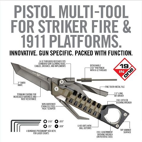 The Pistol Tool — совершенный многофункциональный инструмент 19 в 1, предназначенный для владельцев пистолетов. Благодаря компактному размеру и эргономичному дизайну этот универсальный инструмент удобно помещается в подсумке для магазинов. В комплект входят точные инструменты, такие как шестигранные ключи, биты, втулочные ключи, кирка/скребок, нож Танто и многое другое. Инструмент позволяет регулировать прицелы, чистить огнестрельное оружие, устанавливать аксессуары, выполнять ремонт и вносить модификации. Его долговечность, возможность управления одной рукой и высококачественная конструкция обеспечивают оптимальную производительность. Улучшите свои навыки стрельбы с помощью The Pistol Tool, незаменимого помощника для всех любителей огнестрельного оружия.