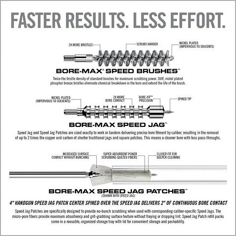 В комплект Bore Max Speed ​​Clean Upgrade Set входят тканевые патчи с вишером для легкой очистки ствола. Патчи из микропористого волокна обеспечивают в четыре раза большую площадь контакта со стенками и канавками ствола, что делает очистку ствола быстрой и эффективной. Микропористое волокно характеризуется максимальной впитывающей способностью, не осыпается и не оставляет ворсинок.