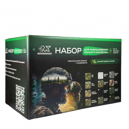 Готовый набор для покраски оружия и элементов экипировки в полевых условиях. Набор камуфляжных трафаретов и оружейная краска в баллонах от компании Эн Кей Новокраска разрабатывался для покраски и маскировки оружия, приборов наблюдения и экипировки, подходит для покраски 1-2 единиц оружия. Уникальный камуфляжный набор с аэрозольной краской не имеет аналогов на рынке, краска малозаметна при использовинии оптики или приборов ночного видения и позволяет окрашивать оружие в полевых условиях. Оружейное покрытие Эн Кей выдерживает перегревы и механические воздействия, не выцветает и имеет низкую ИК ремиссию, что позволит снизить вашу заметность при использовании приборов ночного виденья. Специально подобранная цветовая палитра и трафаретный рисунок обеспечат полное сходство с камуфляжной формой и отличную маскировку на местности. Российская оружейная краска Эн Кей Новокраска - это гарантия качества и долговечности по доступным ценам.