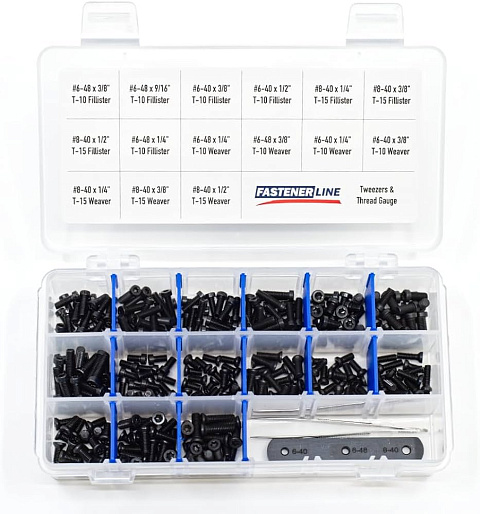 Набор дюймовых оружейных высокопрочных винтов FastenerLine Torx Gun Screws Assortment with Tweezers and Thread Gauge, 302 Pieces.Made in USA. Набор включает 15 видов винтов и по 20 штук каждого вида, пинцет и резьбомер: Fillister (T-10 Torx): #6-48 x 1/4", #6-48 x 3/8", #6-48 x 9/16", #6-40 x 3/8", #6-40 x 1/2"Fillister (T-15 Torx): #8-40 x 1/4", #8-40 x 3/8", #8-40 x 1/2"Weaver-Oval (T-10 Torx): #6-48 x 1/4", #6-48 x 3/8", #6-40 x 1/4", #6-40 x 3/8"Weaver-Oval (T-15 Torx): #8-40 x 1/4", #8-40 x 3/8", #8-40 x 1/2"