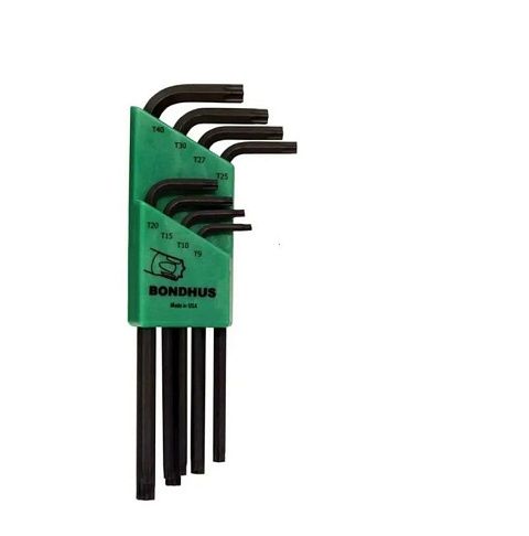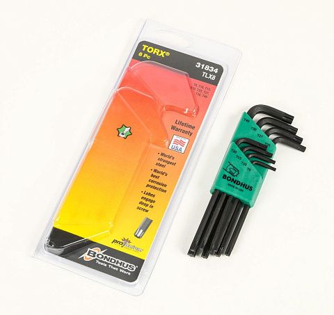 Набор из 8 угловых ключей удлиненных (L)  Torx BONDHUS  размеры  T9-T40L-образныеартикул производителя 31834Это надёжный инструмент известного производителя, который удобно использовать при работе с тугим крепежом .Наличие изгиба позволяет работать с минимальным усилием за счет оптимальной длины одной из сторон инструмента.Тип:   TorxМатериал:   инструментальная стальКоличество в наборе:  8 штРазмер min (Т/E)   T9Размер max (T/E)   T40Форма   угловой (L-образные)Пластиковый держатель в комплектеКомплектация:Ключи размеры : T9, T10, T15, T20, T25, T27, T30, T40Упаковка: блистерПроизводство США