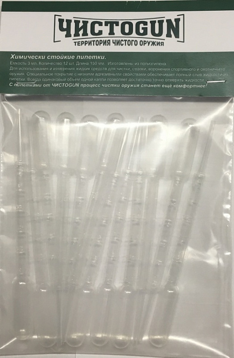 Емкость 3 мл, количество 12 шт. Длина 150 мм. Изготовлены из полиэтилена. Для использования и измерения жидких средств для чистки, смазки, воронения спортивного и охотничьего оружия. Специальное покрытие с низкими адгезивными свойствами обеспечивает полный слив жидкости из пипетки. Всегда одинаковый объём одной капли позволяет достаточно точно отмерять жидкости.