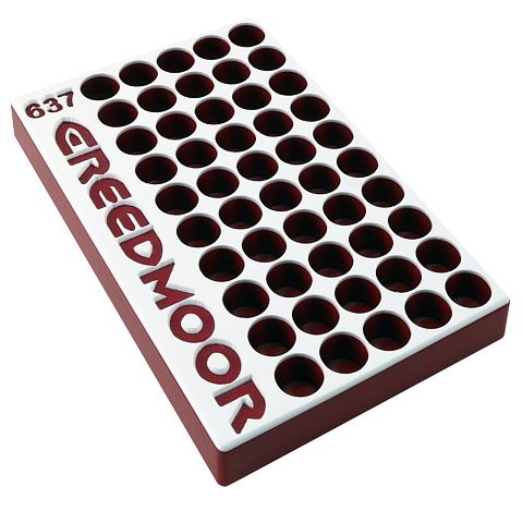Этот блок предназначен для патронов с диаметром головки гильзы 0,637 (или близкого к нему), таких как патроны на базе .375 CheyTac. Полимерные блоки HDPE можно безопасно мыть в посудомоечной машине.  Поверхность белая, поэтому просыпанный порошок будет виден.   Блок на 50 патронов имеет размеры 7,75"Д x 5"Ш x 0,75"Т (конфигурация отверстий 5 x 10)