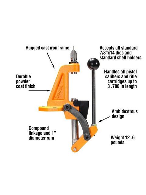 Пресс для релоадинга Lyman Brass-Smith Ideal Press - идеальная отправная точка как для начинающих, так и для опытных снаряжателей патронов. Компактный дизайн требует минимум места на рабочем столе, но при этом имеет солидный вес и прочность. Надежный каркас пресса сделан из чугуна, а все остальные детали из стали. Пресс имеет оптимальный рычаг и соотношение размеров деталей. Толщина поршня 2,5 см и посадочное отверстие для матриц 3 7/6 дюйма, которое умещает большинство пистолетных и нарезных калибров с общей длиной посадки до 3,700''. Пресс имеет один центральный рычаг, который можно использовать как в правостороннем расположении, так и в левостороннем с удобной шарообразной головкой на конце для удобного хвата. Ideal Press от Lyman позволяет использовать все матрицы с резьбой 7/8x14 и стандартные шелхолдеры. Пресс Lyman обеспечит аккуратность и точность как начинающим, так и профессионалам. Прекрасный дополнительный инструмент для тех, кто дополнить свой основной пресс запасным. Основные преимущества пресса для релоадинга Lyman Brass-Smith Ideal Press Вес 13,8 фунтов (5,7 кг) Сделано в США