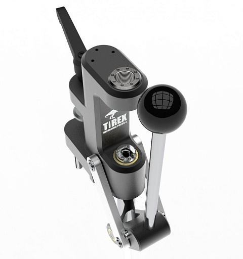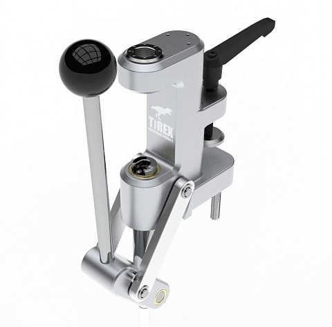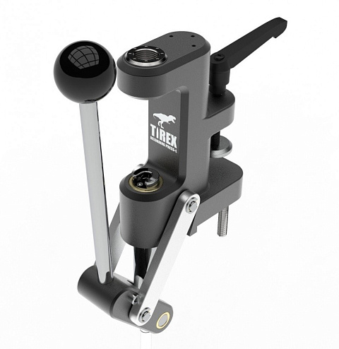 Tirex L – данный пресс поставляется в кейсе, является компактным и универсальным решением как для охотников так и для спортсменов. Основным преимуществом является возможность мобильного крепления при помощи встроенной струбцины, но при этом есть и стандартное стационарное крепление. Пресс рассчитан как основной инструмент для снаряжения средних патронов. Мобильное крепление позволяет быстро закрепить пресс, например на кухонной столешнице, а после окончания работы так же быстро демонтировать и убрать в кейс. Его всегда можно взять с собой на соревнования. Но при этом стационарное крепление позволяет его использовать как основной инструмент для релоадинга средних калибров. Станина пресса выполнена из цельного куска дюралюминия методом 3Д фрезерования. Пары трения как и у старшего брата выполнены с использованием бронзовых графитонаполненных втулок. Оси и штоки выполнены из высокопрочной легированной стали с полированной поверхностью Ra 0.2-0.4. Кинематика пресса имеет переход «мёртвой точки» для более комфортной работы при его малых габаритах. Переходная втулка под матрицы имеет общепринятый стандарт резьбы 7/8-14 UNF и подходит для всех матриц, которые изготавливаются такими компаниями как Redding, RCBS, LEE, HORNADY и другие.