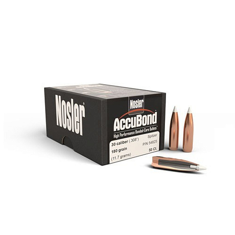 Пули AccuBond .30 Calibre 180 Grain (.308) Spitzer Boat Tail от Nosler с использованием эксклюзивного процесса склеивания, устраняющего пустоты в сердечнике пули, соединяют проверенную Nosler оболочку из медного сплава со специальным сердечником из свинцового сплава. В результате пуля летит точно, проникает глубоко и сохраняет свой вес, не вызывая сильного загрязнения ствола. Уникальный наконечник из белого полимера устойчив к деформации и расширяется при ударе. Твердое основание Нослера в задней части пули действует как платформа для грибов большого диаметра.