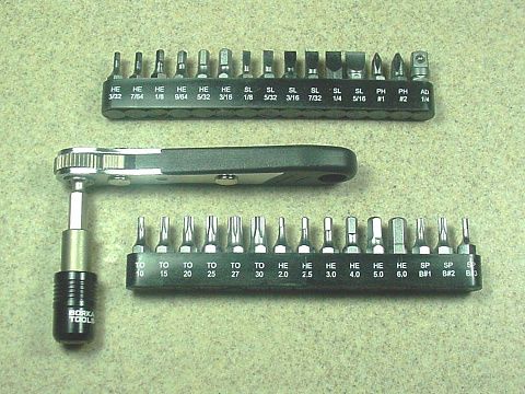 В этот набор входит:    1. Компактная низкопрофильная рукоятка с храповым механизмом 1/4" шестигранник (F)    2. Держатель бит Autolock (быстросъемный замок) длиной 2"*    3. Адаптер с шестигранника 1/4" (M) на квадратный привод 1/4" (M)    4. Хромированные биты для отвертки из стали S2 длиной 1" (всего 29):        Шестигранные, дюймовые: 3/32, 7/64, 1/8, 9/64, 5/32, 3/16        Шестигранные, метрические: 2, 2,5, 3, 4, 5, 6        Звездообразные: T-10, T-15, T-20, T-25, T-27, T-30        Шлицевые: 1/8, 5/32, 3/16, 7/32, 1/4, 5/16        Phillips: #1, #2        Другие биты**: запасные T-10, T-15, T-20    5. Упакованы в полиэтиленовый пакет толщиной 4 мил с возможностью повторного закрывания.   *Можно использовать с прилагаемым храповым механизмом или в патроне электродрели.  **Эти биты находятся в гнездах с маркировкой SPB#1, SPB#2 и SPB#3.