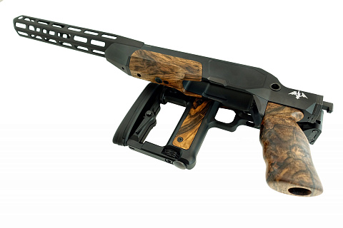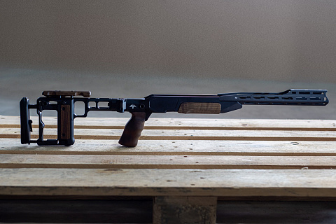 Фурнитура (рукоятка, крышка корпуса, накладка на щеки, боковые панели приклада) изготовлена из орехового дерева.