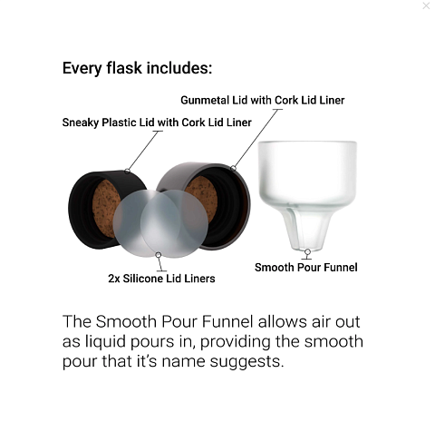 В комплекте: Стеклянная фляга объемом 240 мл, ударопрочная Мягкий силиконовый чехол Пластиковая крышка с пробковой вставкой Металлическая крышка с пробковой вставкой Воронка для удобного наливания Две силиконовые прокладки для крышки (замена пробковых прокладок)